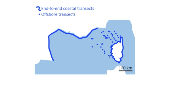 Profondeur : 0-1 m (surface).Méthode d’échantillonnage : deux filtres de 30 litres sur 700 transects non chevauchants de 2 km, utilisant deux pompes péristaltiques de chaque côté d’un bateau.