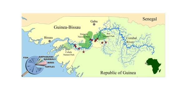 Parmi les autres vertébrés détectés, on note des espèces associées aux milieux aquatiques comme l’hippopotame commun Hippopotamus amphibius, vulnérable, et la tortue molle du Sénégal Cyclanorbis senegalensis, ainsi que des espèces vivant dans les forêts bordant le fleuve Corubal, telles que le colobe bai de Temminck Piliocolobus badius temminckii, en danger, le colobe pie occidental Colobus polykomus et le mangabey fuligineux Cercocebus atys, vulnérable.